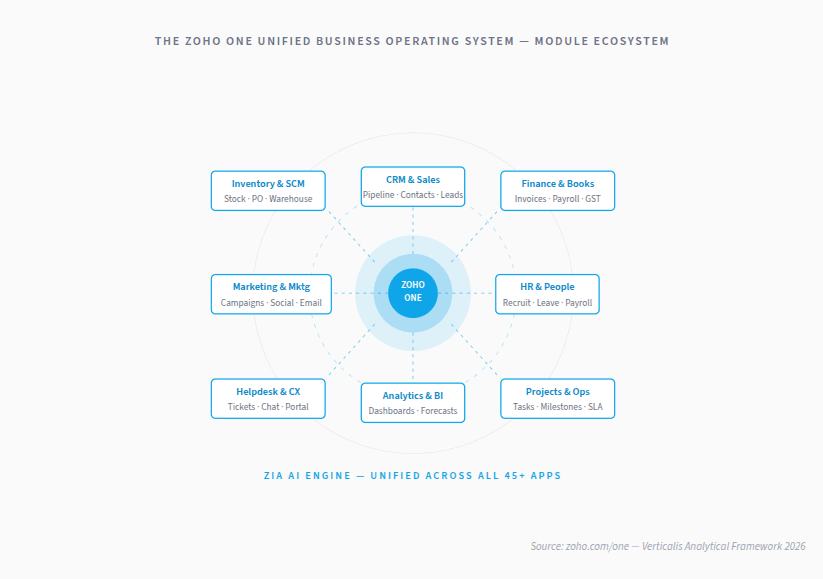 Zoho ERP is not a single product. It is an integrated business management architecture built on the Zoho One platform—a suite of 45+ enterprise-grade applications covering every business function from lead capture to financial close, from employee lifecycle to customer success.