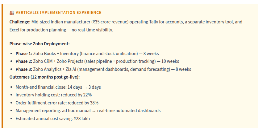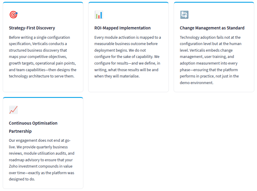 A techno-managerial consultant asks: "which Zoho modules are right for your industry?" A Verticalis consultant asks: "what does your business need to achieve in the next 36 months, and how do we architect a technology foundation that makes those outcomes inevitable?"