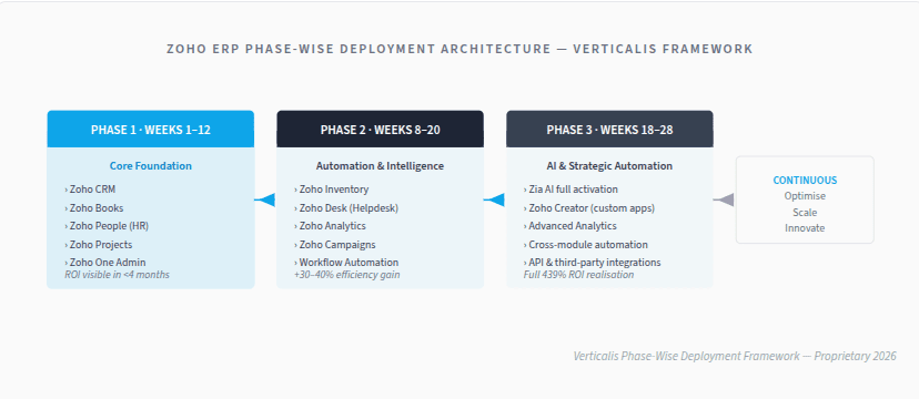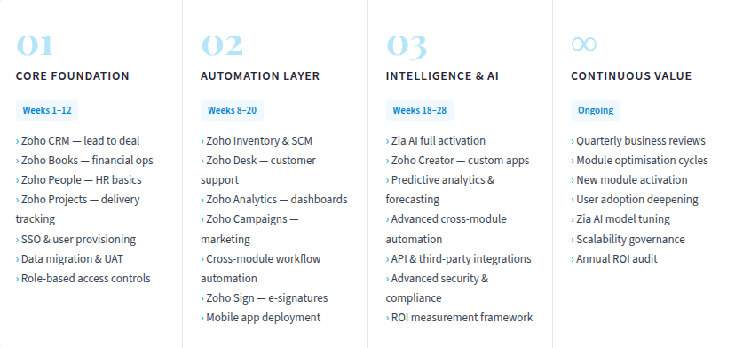 One of the most important strategic insights I can offer any business leader is this: a unified ERP strategy does not require a big-bang deployment. The very thing that makes Zoho One architecturally superior—its modularity—also makes it the ideal platform for a disciplined, phase-wise rollout that delivers value at every stage while building toward the complete automation vision.