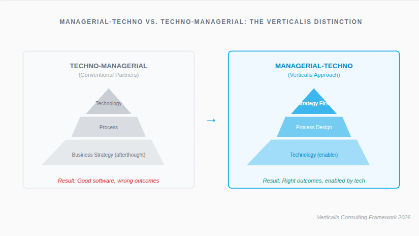 At Verticalis, we have built our practice around a fundamental philosophical inversion that distinguishes us from every technology-first consultancy in the market. We call it the Managerial-Techno approach—and the distinction is not cosmetic.